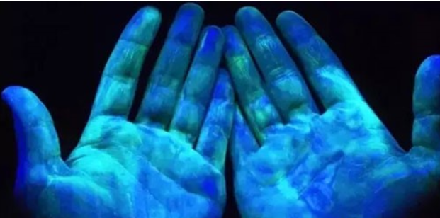 据报道说,这些师生当时是在用紫外灯进行一个“观察细菌”的实验。说是“细菌实验”,但这里所用的应该不是真正的细菌,而是一种常被用来模拟细菌的荧光材料。这种材料中含有与细菌个头大小类似的微粒,它们在紫外光的作用下会发出绿色的荧光。它经常被用于模拟细菌的传播过程,帮助人们理解洗手等卫生措施的重要性。